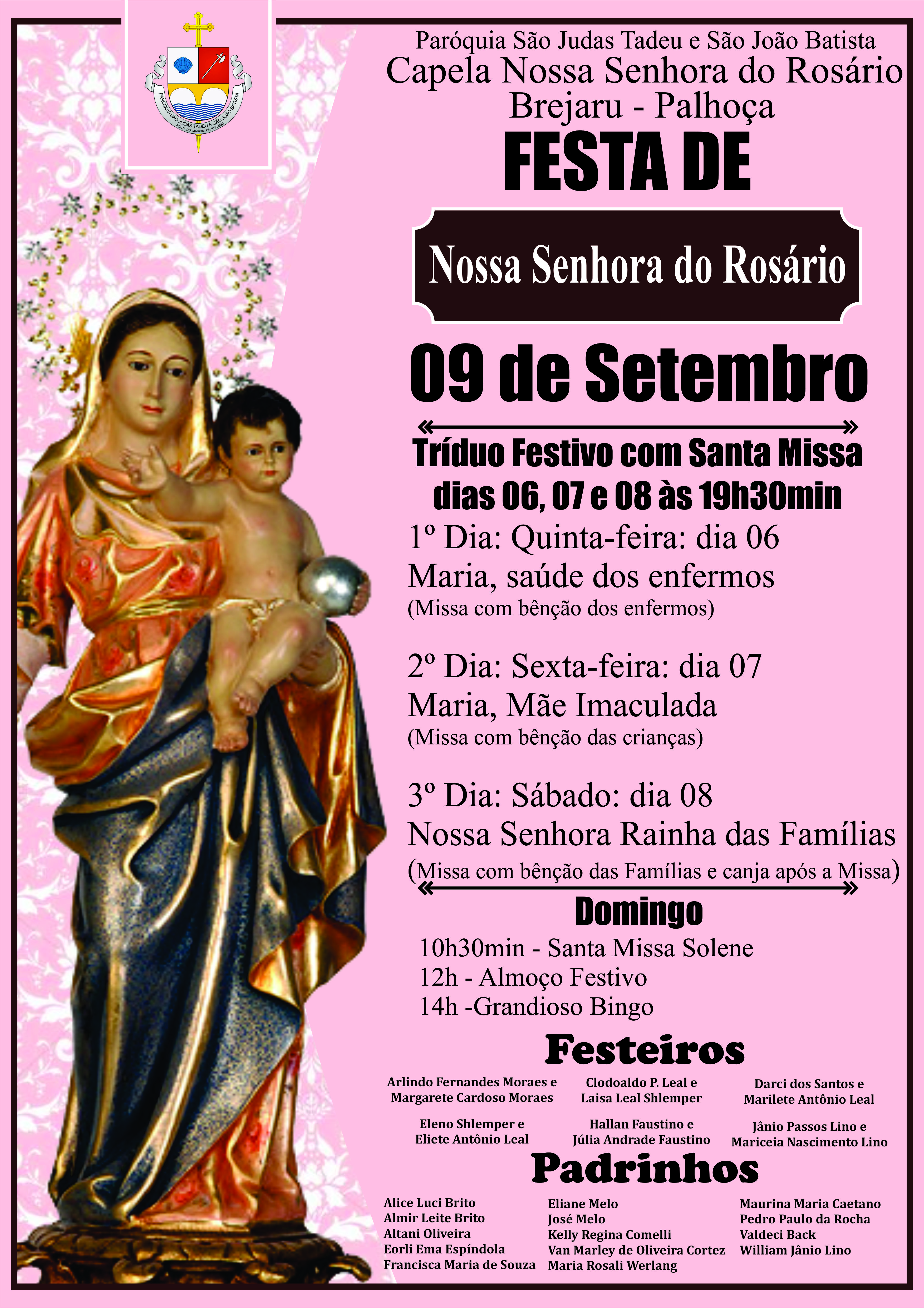 A Comunidade Nossa Senhora do Rosário, no Brejaru, convida a todos para participarem da Festa em honra à Padroeira, que acontecerá no dia 09 de setembro.