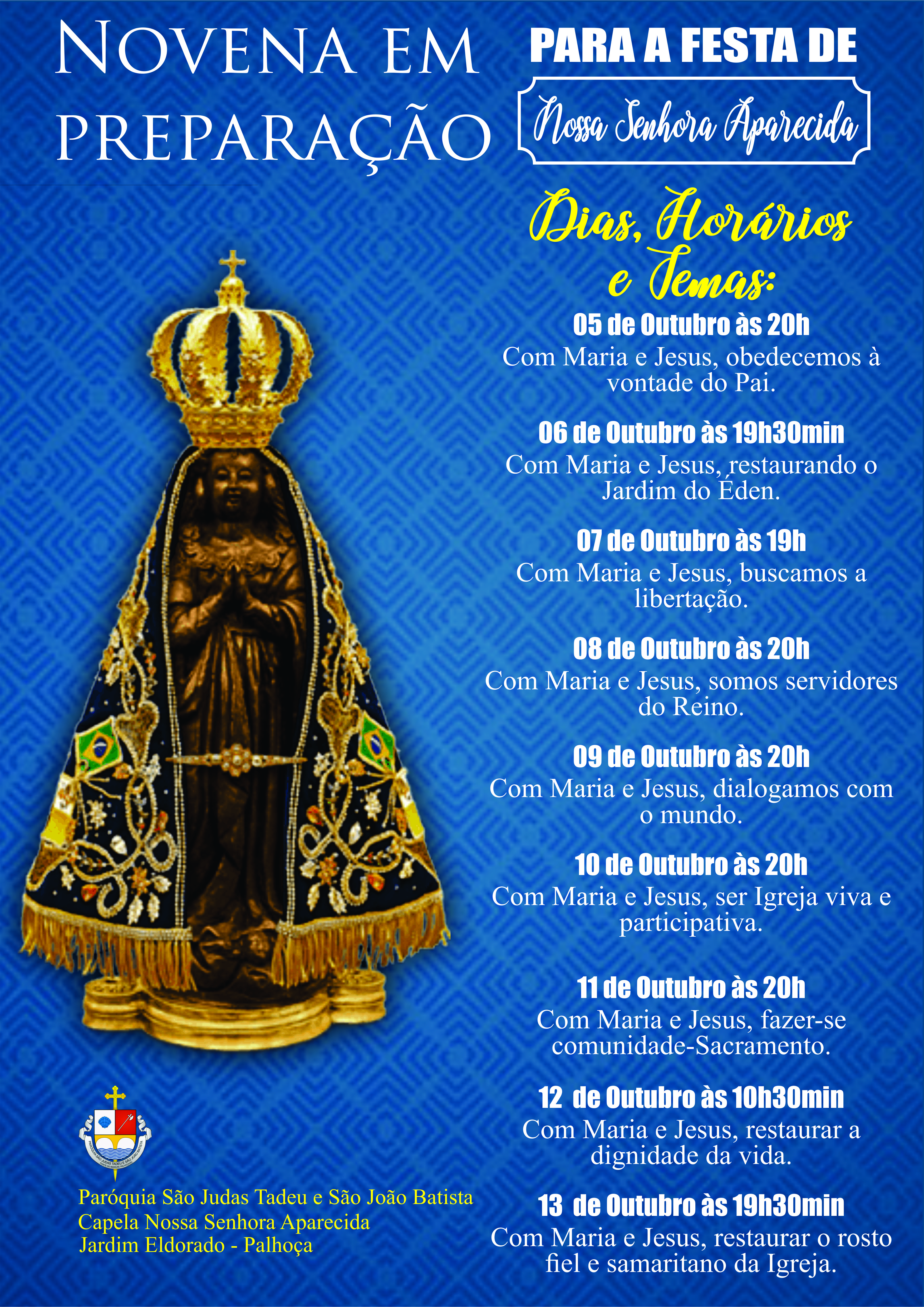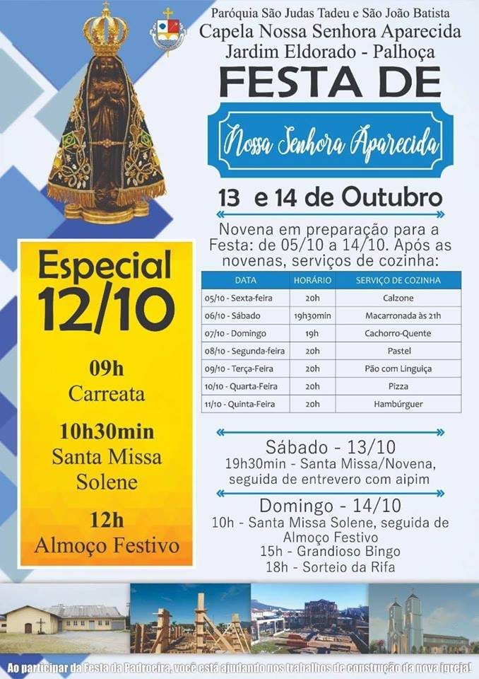A Comunidade Nossa Senhora Aparecida, no Jardim Eldorado, convida você e seus familiares para participarem da Festa de Aparecida, que acontecerá nos dias 13 e 14 de outubro.