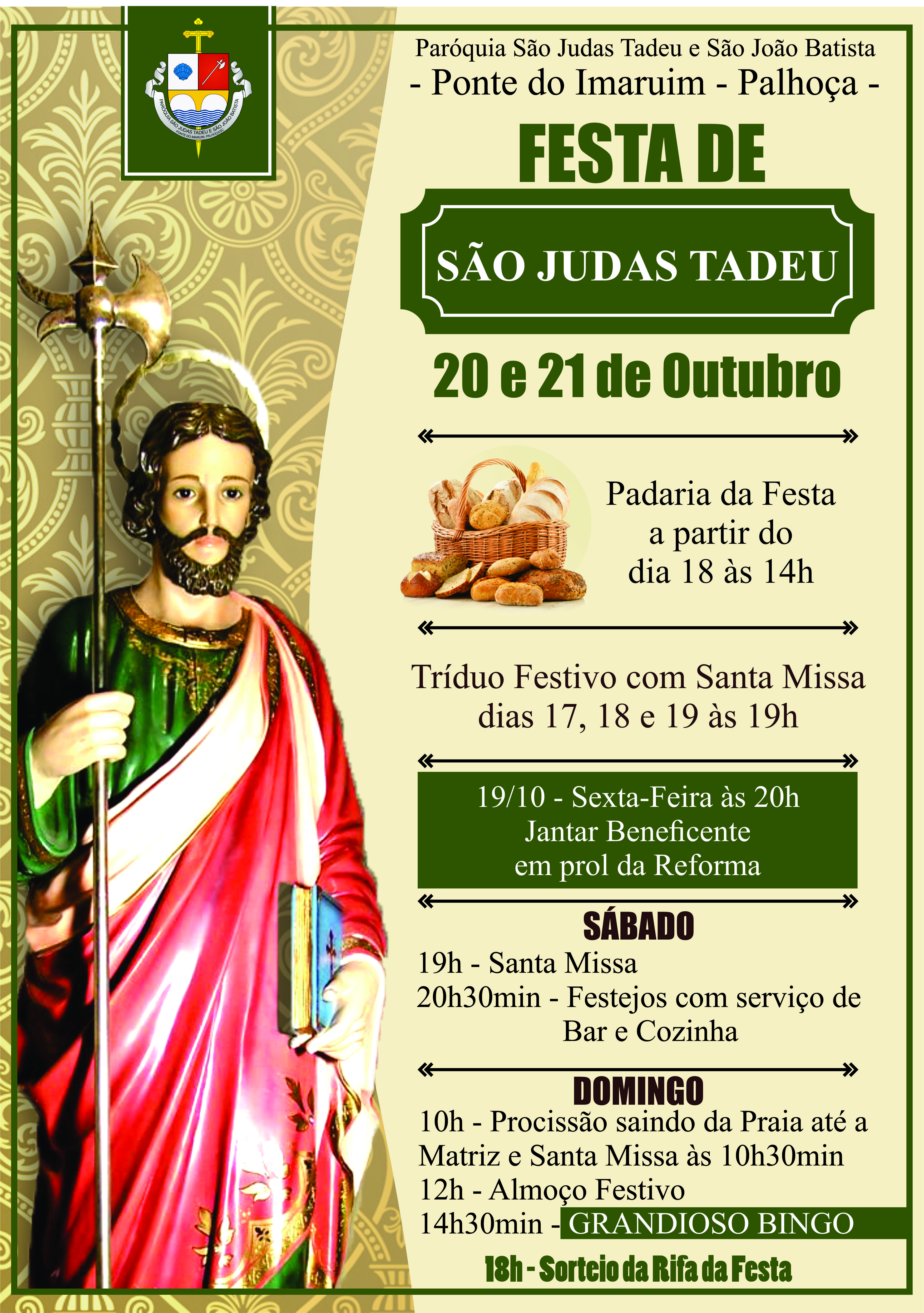 No próximo final de semana, acontece a Festa de São Judas Tadeu, na Igreja Matriz. De quarta à sexta-feira acontece o tríduo de preparação, com Santa Missa às 19h. Quinta-feira inicia a padaria da festa, seguindo até domingo.