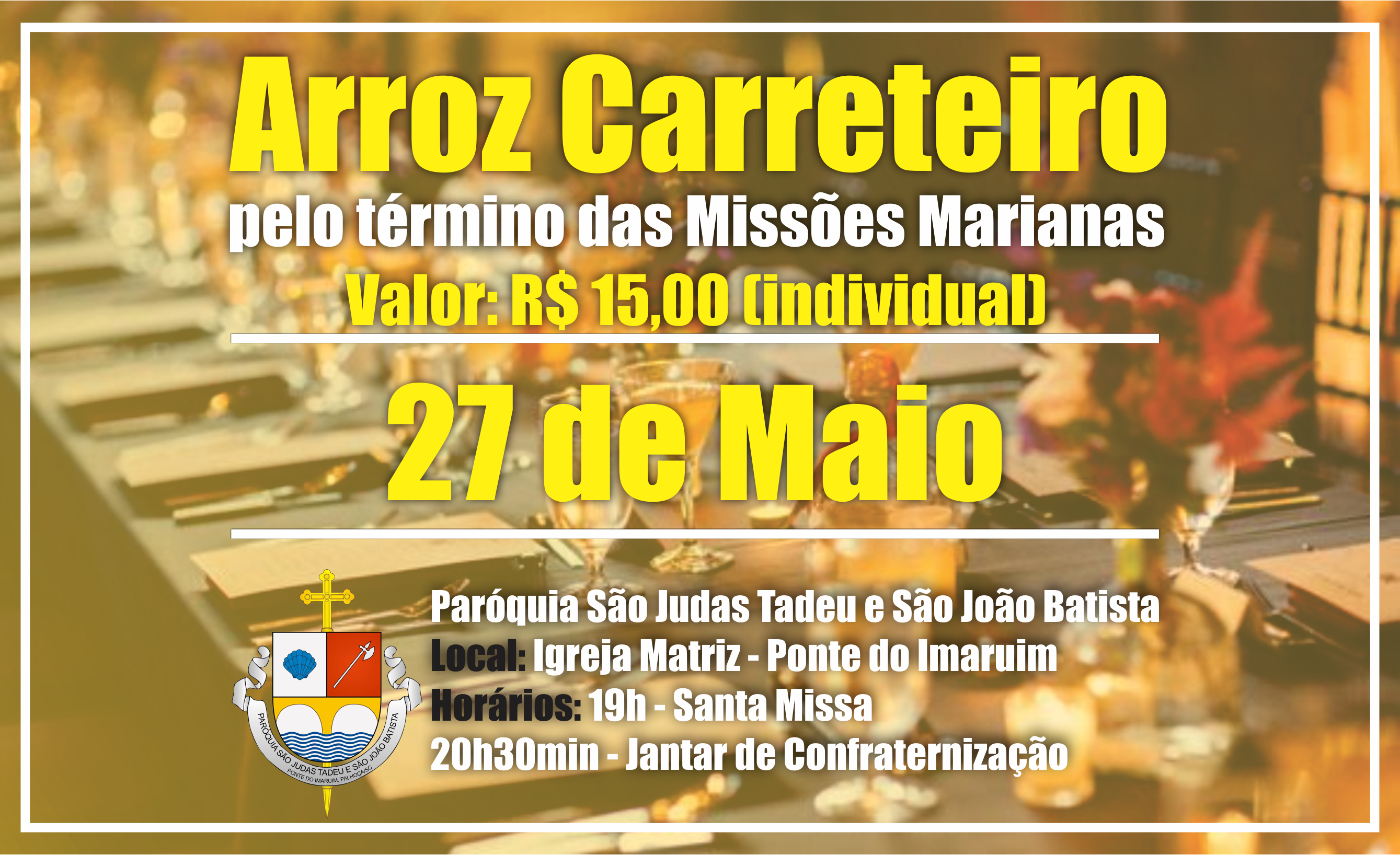 · 19h00 – Missa de encerramento da Missão Mariana na Igreja Matriz, com a solene coroação da imagem peregrina de Nossa Senhora de Fátima. Jantar após a Santa Missa de encerramento, com ingressos, no valor de R$ 15,00.