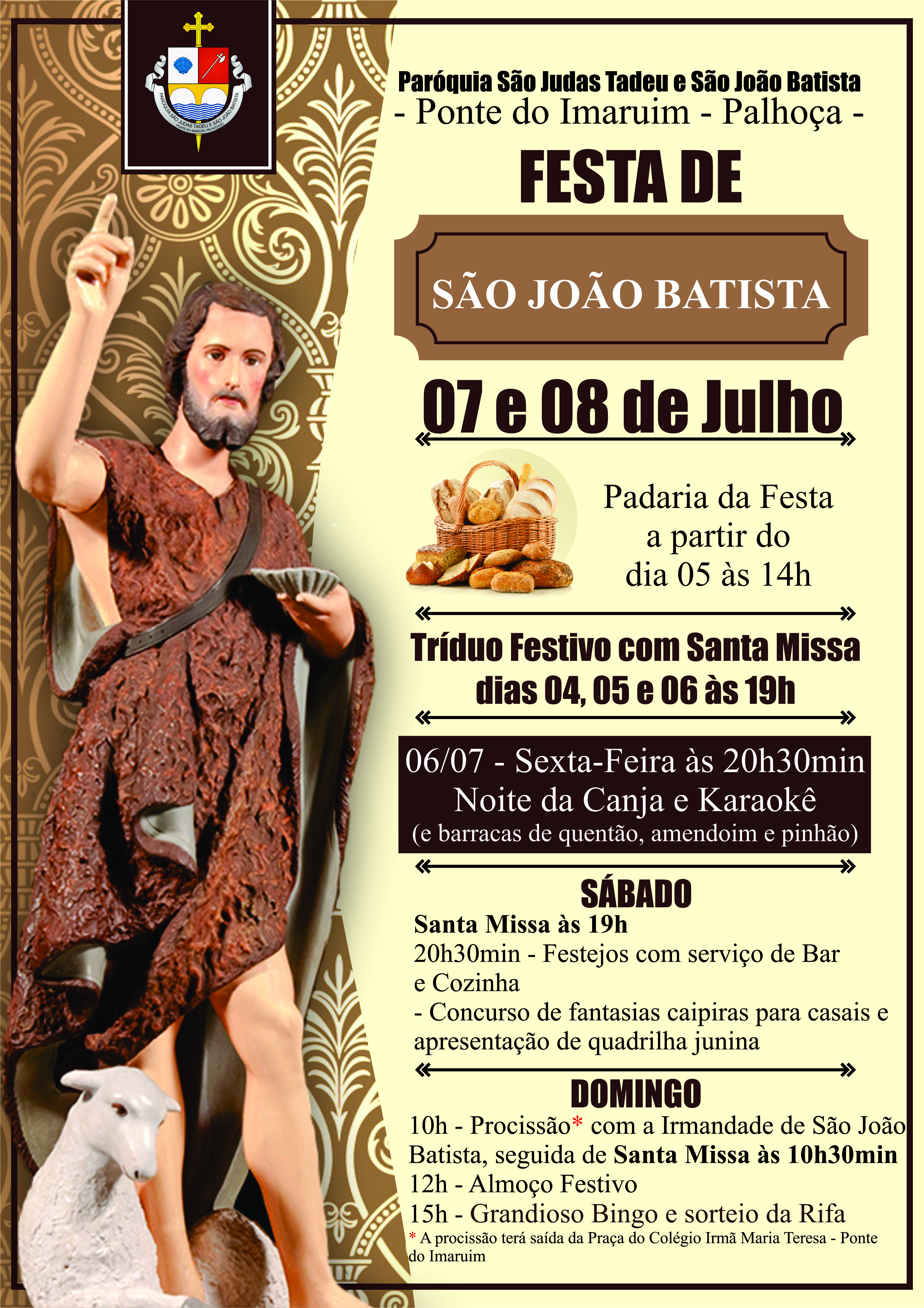 A Comunidade Matriz de nossa Paróquia, convida você e sua família para a Festa em honra ao Padroeiro, São João Batista. Anote em sua agenda e participe conosco!