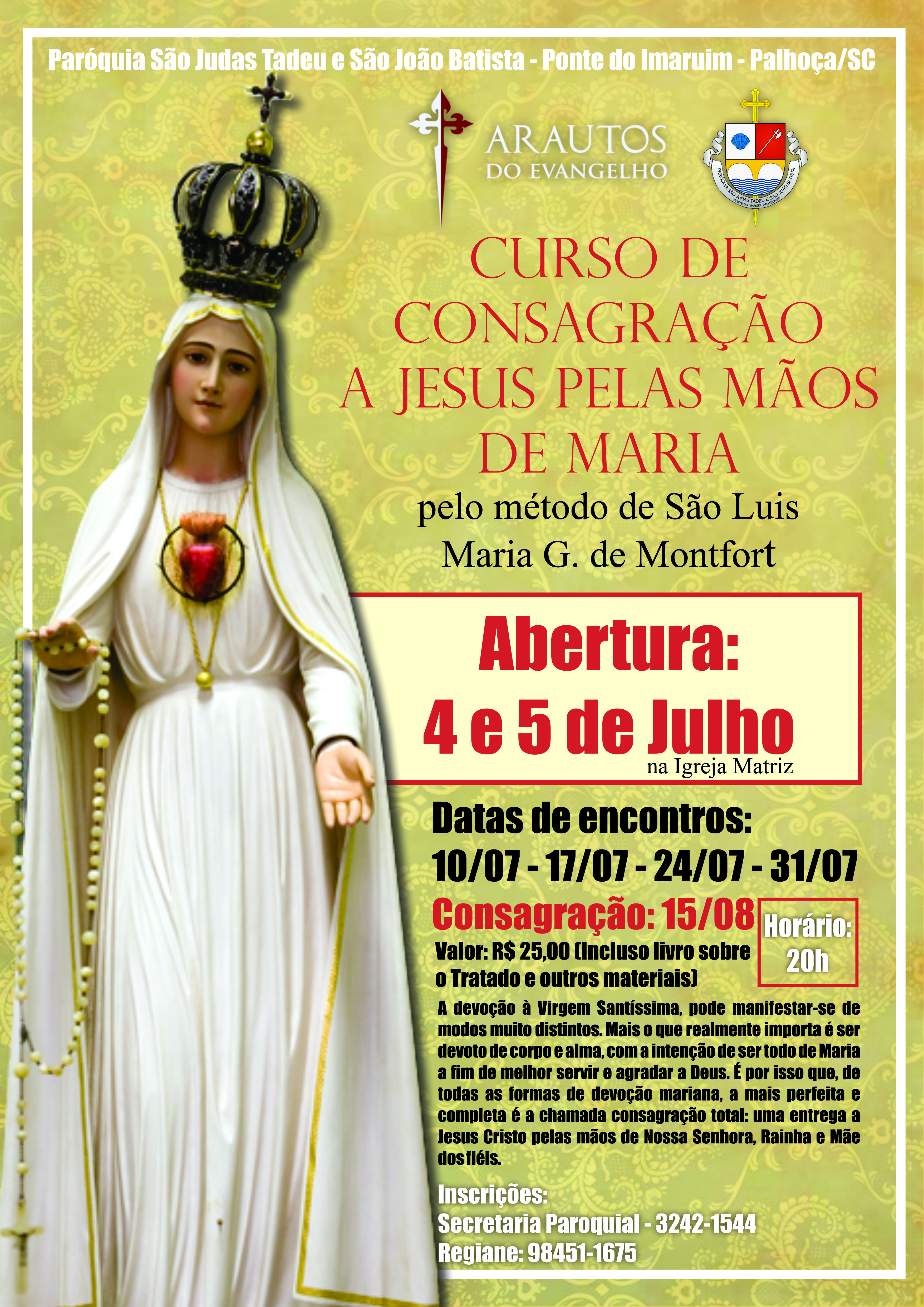 Neste período, e em comunhão com o Plano de Pastoral Paroquial, nossa paróquia irá receber os Arautos do Evangelho para realizar uma Semana Missionária Mariana.